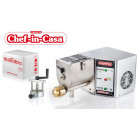 Kneads, makes the pasta dough sheet and draws long and short pasta. Chef in Casa is a compact and reliable counter-top machine, suitable for both professional kitchens and anyone who likes making homemade pasta. Chef in Casa kneads all types of flour and produces long and short pasta by simply changing the drawplate. The machine comes with a drawplate for a 170mm-wide sheet of pasta dough and a manual rotating pasta-cutter knife for short pasta. It is fitted with a complete line of accessories (which can be purchased separately). The external framework is in anodised aluminium, the parts that come into contact with the pasta are in stainless steel, and it also features a simple, ergonomic button panel, making it a reliable machine in full compliance with current safety regulations.
