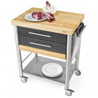 Corian black kitchen cart of the series Auxilium with two drawers, one pull out cutting board and one shelf underneath. The hornbeam long grain worktop is very sturdy and resistant. The drawers are made of stainless steel and can be easily detached for cleansing. The cutting board of black polyethylene (or of hornbeam) is placed under the second drawer and can be placed on the worktop. It is been hold in place by a stop bar. The cart has one side rail on the left and one on the right for quick fitting of accessories or a kitchen cloth.