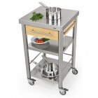 Stainless steel kitchen cart of the series Auxilium with two shelves underneath and one drawer. The stainless steel worktop is very sturdy and resistant. The drawer is made of stainless steel and can be easily detached for cleansing. The cart has one side rail on the left and one on the right for quick fitting of accessories or a kitchen cloth.