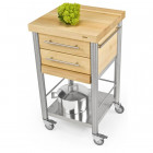 Hornbeam kitchen cart of the series Auxilium with two drawers, one pull out cutting board and one shelf underneath. The long grain hornbeam worktop is very sturdy and resistant. The drawers are made of stainless steel and can be easily detached for cleansing. The cutting board of hornbeam is placed under the second drawer and can be placed on the worktop. It is been hold in place by a stop bar. The cart has one side rail on the left and one on the right for quick fitting of accessories or a kitchen cloth.