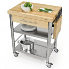 Long grain hornbeam kitchen cart of the series Auxilium with two shelves underneath and one drawer. The long grain hornbeam worktop is very sturdy and resistant. The drawer is made of stainless steel and can be easily detached for cleansing. The cart has one side rail on the left and one on the right for quick fitting of accessories or a kitchen cloth.