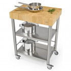 Stainless steel kitchen cart with two shelves underneath and no drawer. The working top of end grain hornbeam is very robust and resistant. A cart without a drawer is optimized for maximum storage.