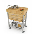Hornbeam kitchen cart of the series Auxilium with two drawers, one pull out cutting board and one shelf underneath. The end grain hornbeam worktop is very sturdy and resistant. The drawers are made of stainless steel and can be easily detached for cleansing. The cutting board of hornbeam is placed under the second drawer and can be placed on the worktop. It is been hold in place by a stop bar. The cart has one side rail on the left and one on the right for quick fitting of accessories or a kitchen cloth.