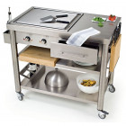 The teppanyaki grill cart from JOKODOMUS is made for perfect cooking results. The special technique of the stainless steel griddle assures best temperature distribution and constant power. A must for passionate cooks which love to prepare fresh ingredients while enhancing natural taste and create punctual flavours. On the fry top teppanyaki griddle from JOKODOMUS you can cook and fry without additional fat and unhealthy burning on; and also you can prepare different food in sequence without taste transmission. A smart technology; and finally also the cleansing is easy to do.